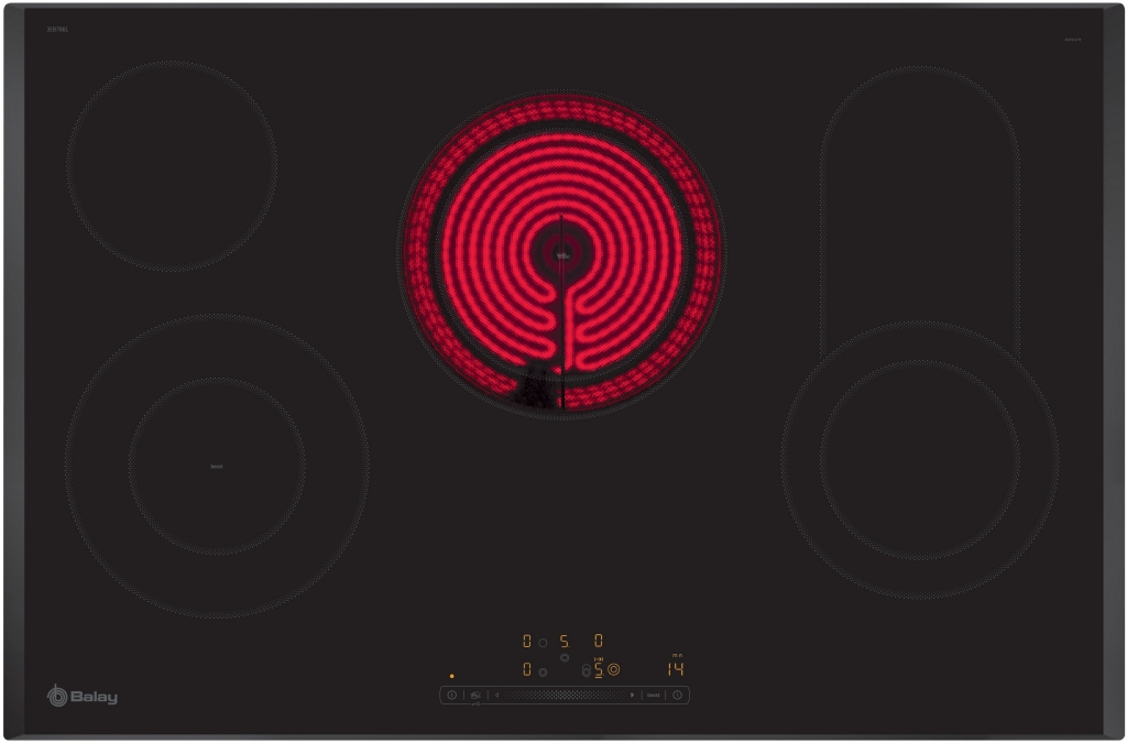Flexibilidad de las zonas de cocción. Control deslizante Balay 4 zonas vitrocerámicas: Zona delantera izquierda: doble de 12, 21 cm. Zona trasera izquierda: 15 cm. Zona de cocción central: 180 mm, 230 mm, 1.7 kw (potencia máx. 3.4 kw) Prestaciones destacadas Programación de tiempo de cocción para cada zona. Función Alarma con duración de aviso regulable. Función Silencio: posibilidad de desconectar los avisos sonoros. Función Limpieza: bloqueo del control. Ahorro de tiempo y eficiencia zona Numero de zonas cocción: 4