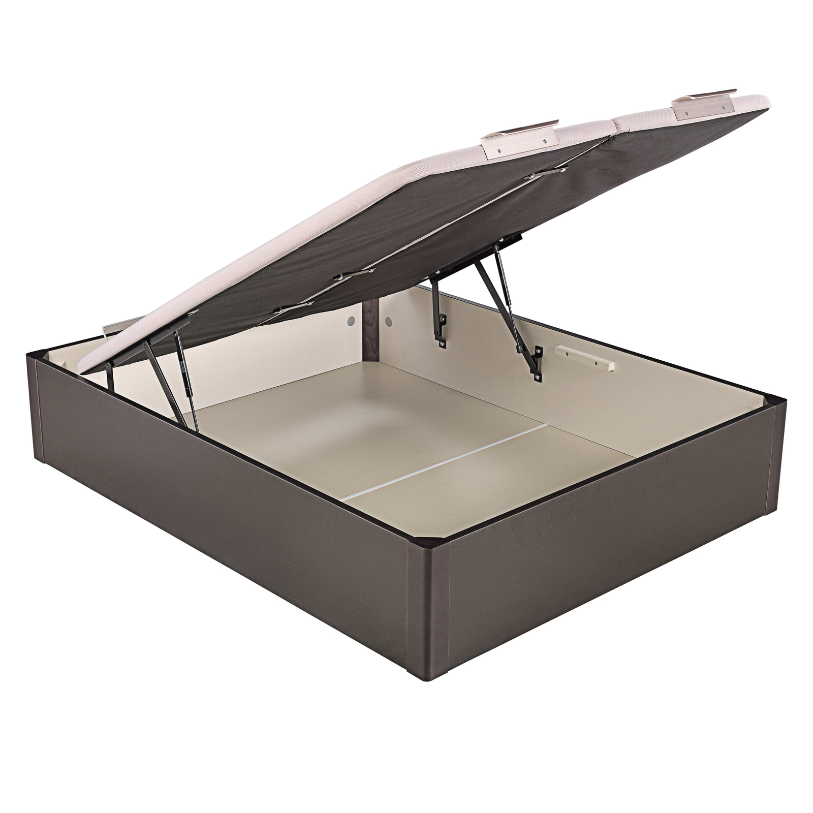 La tapa es transpirable de máxima durabilidad e incorpora una estructura metálica de acero de gran resistencia y un tapizado con tejido 3D transpirable aportando la tecnología Base Air System (B.A.S). Tiene un tirador de aluminio y un arquillo que sujeta el colchón.